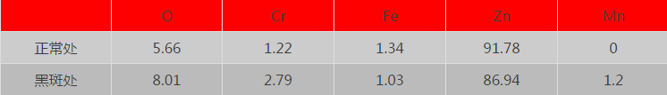 我們從上表來看,黑斑處的成分與正常處的成分相似。但黑斑處氧的成分比正常處多2%,黑斑處鋅的成分比正常處少了近5%,可以判斷黑斑處發生了氧化
