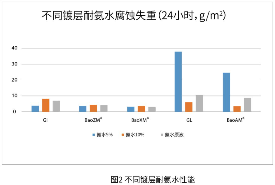 在氨水試驗(yàn)中,熱鍍鋅、BaoZM®、BaoXM®失重均比鍍鋁鋅和BaoAM®低(圖2)。