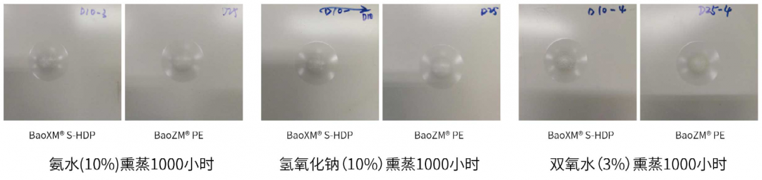 采用BaoZM®和BaoXM®基板的S-HDP涂層或者聚酯(PE)涂層鋼板經(jīng)過(guò)杯凸加工后,在1000小時(shí)氨水、氫氧化鈉、雙氧水熏蒸下,涂層均完整。