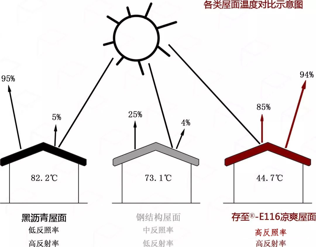 即可以在彩鋼板屋面使用存至®-E116隔熱降溫系統,該系統能對400-2500nm范圍的可見光與近紅外線進行高反射,全面反射85%太陽光和對外反射95%的太陽能(即熱能),有效阻止太陽光的熱量累積,其涂料組份中微結構成分特殊的快速散熱特性使得95%以上太陽輻射能量不被建筑體吸收,隔住外部熱量向建筑體內部傳導,確保了建筑體內部空間保持持久恒溫的狀態,是真正意義上的隔熱。該系統有效降低了屋面溫度15-30°C,室內溫度3-5°C(實驗室數據,具體因現場環境存在差異),降低空調降溫費用達20%-70%。隨著我國對于建筑隔熱節能工作的政策性指導,以及廣泛提及的"綠色建筑"領域,都是在倡導有效的隔熱保溫、節約電力、保護環境、節約能源。