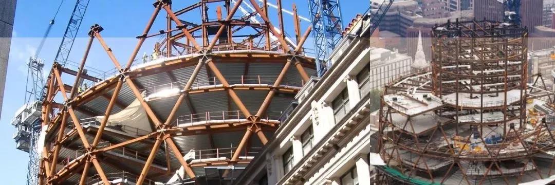 結構形式為鋼框筒外加螺旋網格,六角形節點板連接各向網格以及樓面梁。