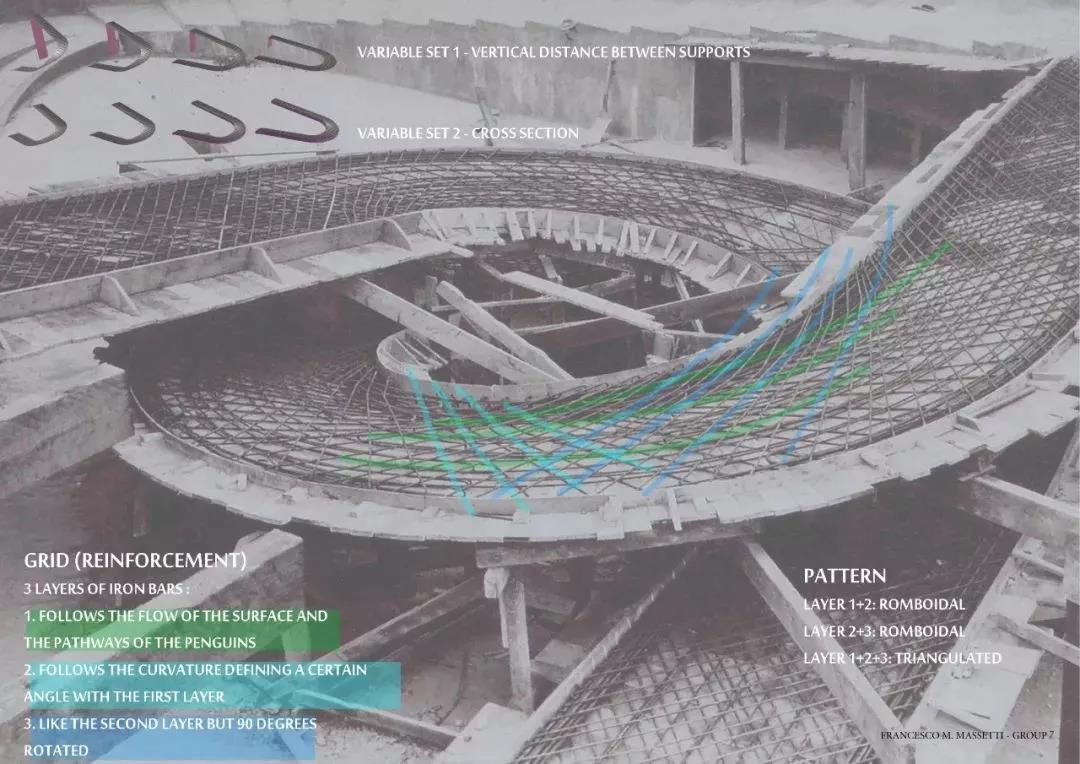 雙螺旋樓梯主要支撐在外圈的索網上,所以螺旋外側做強,為較粗圓鋼管,同時連續的雙螺旋樓梯也提高了索網的穩定性。